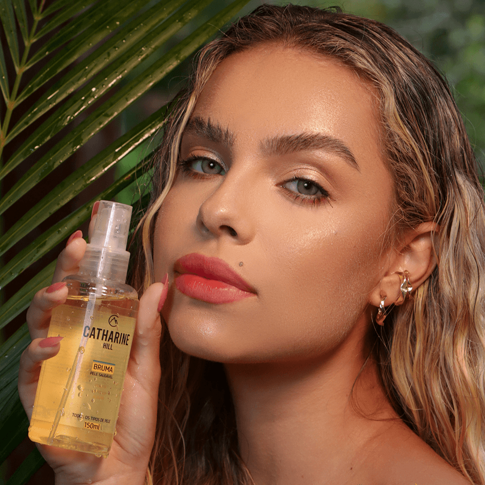 A Bruma da Catharine Hill contém extrato de camomila, chá verde e aloe vera que auxiliam na hidratação, refrescando e acalmando a pele. ideal para ser utilizado antes e após a make, dando luminosidade, pode ser usado também na rotina de skin care, além de poder utilizar a noite para acalmar e hidratar a pele durante o sono.