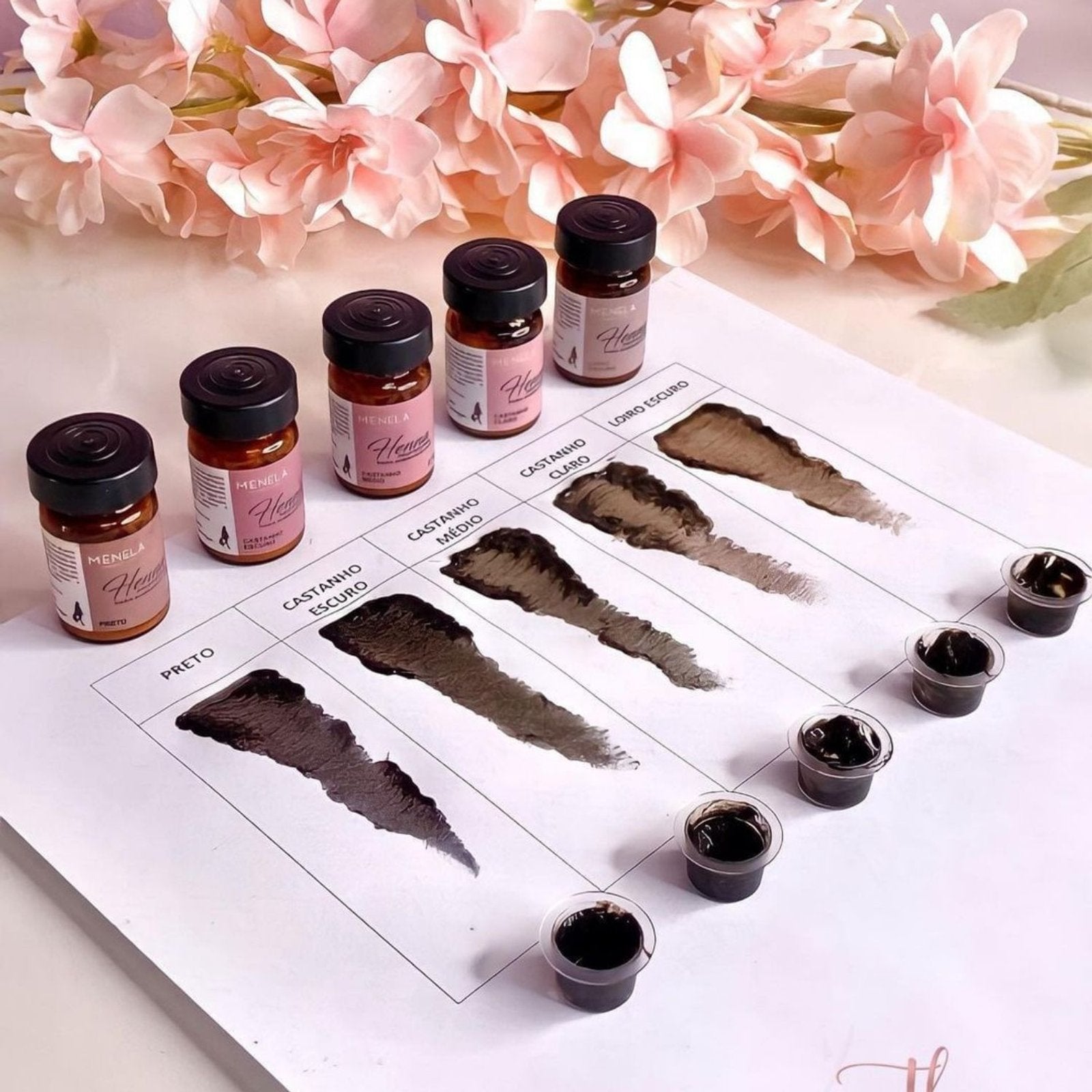 Kit completo Menela com henna preta intensa e fixador com extrato de bambu para sobrancelhas definidas e duradouras. Fórmula sem amônia e testada dermatologicamente, proporciona cor profunda e acabamento natural com aplicação fácil.